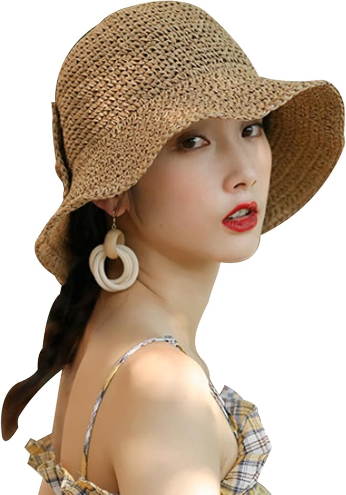 Womens Floppy Straw Sun Hat Foldable Roll up Wide Brim Beach Caps for Women, Crochet Bucket Hat