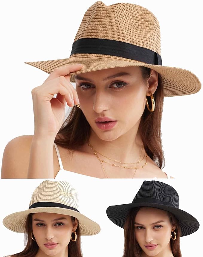 3PCS Womens Wide Brim Beach Hat Roll up Panama Straw Sun Hat Fedora Summer UV Protection Floppy Hat (Black+Brown+Beige)