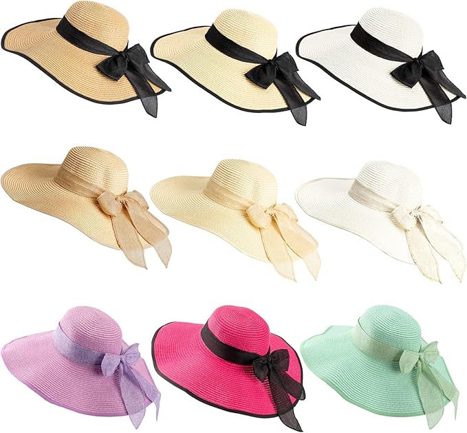 9 Pcs Women Sun Straw Hat Wide Brim Summer Big Bowknot Straw Hat Floppy Beach Hats Foldable UV Upf50 Protection Beach Cap