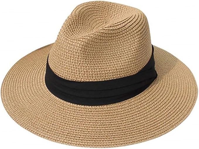 Women Fedora Sun Hat Wide Brim Straw Panama Hat Straw Hat Floppy Foldable Roll-Up Beach Cap Summer Hat Khaki