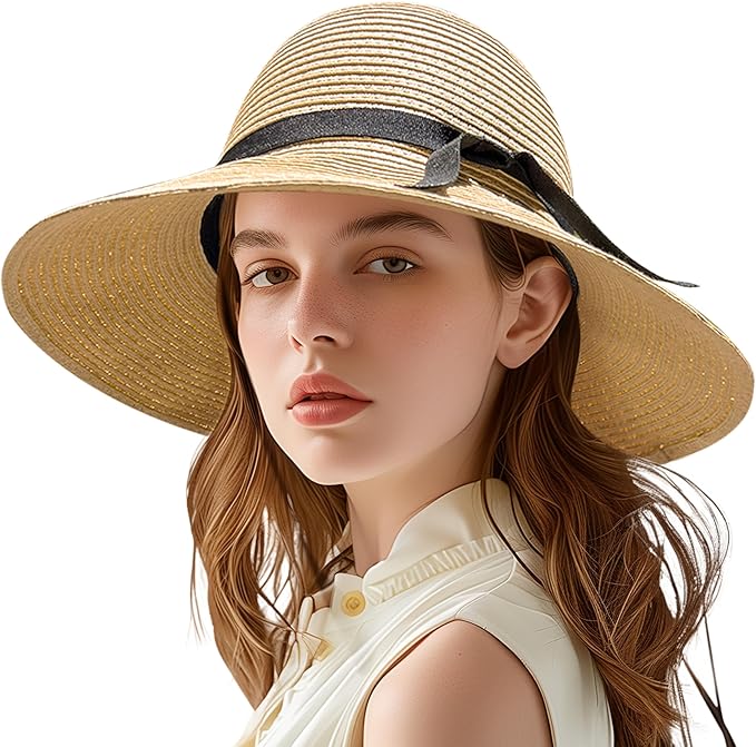 Sun Hat for Women, 3.9" Wide Brim Foldable Straw Hat with Chin Strap, with Shaping Wire, UV Protection with Bow Belt