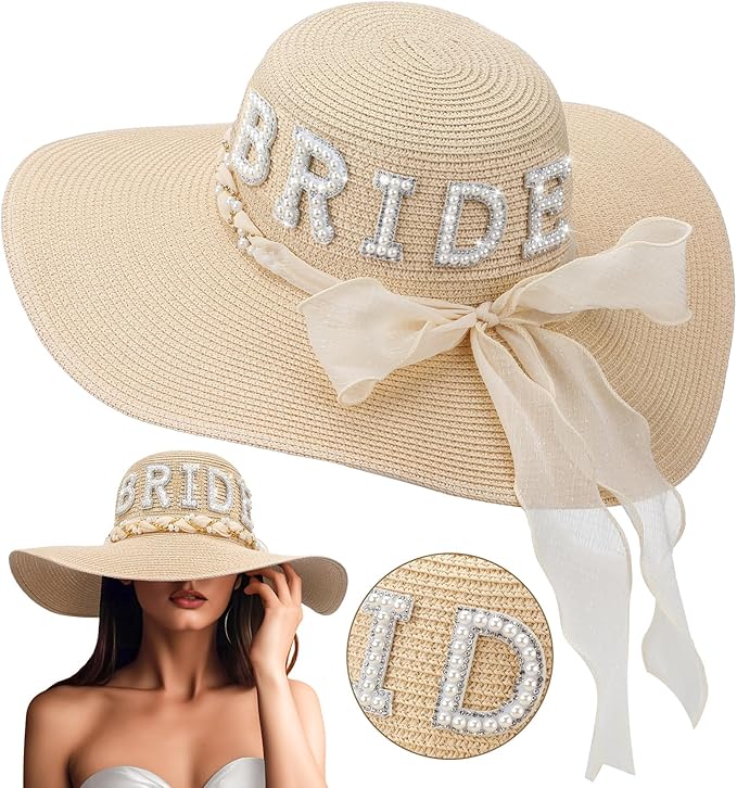 Bride Sun Hat Wide Brim Straw Hat Floppy Bride Beach Hat for Women Bridal Honeymoon Wedding Party Engagement