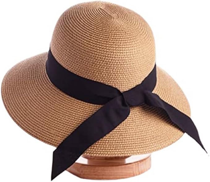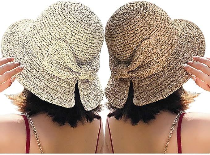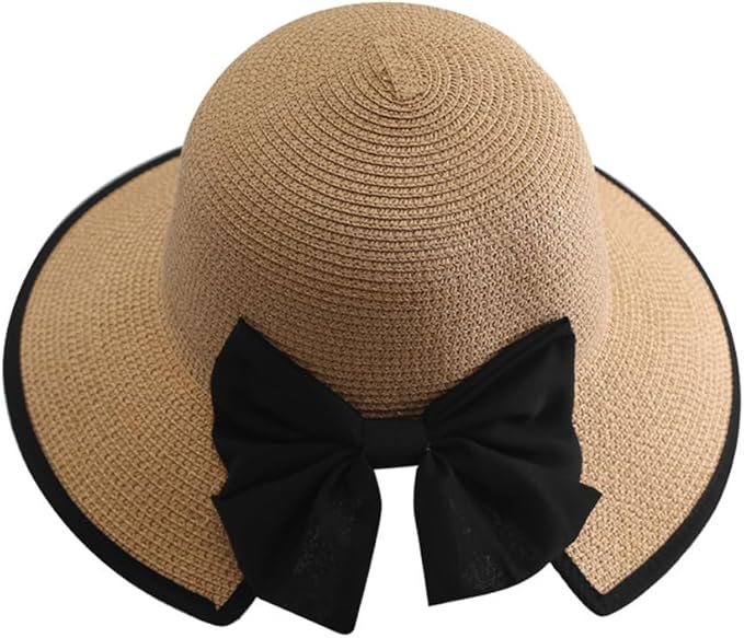 Women Big Bowknot Straw Hat Wide Brim Summer Hat Large Floppy Foldable Roll-Up Straw Beach Hat Beachwear Sun Hat (Khaki)