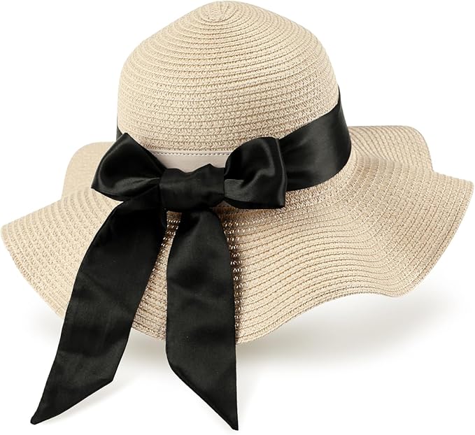Foldable Wide Brim Floppy Straw Beach Sun Hat,Summer Cap with Bowknot for Women Girls,Strap Adjustable