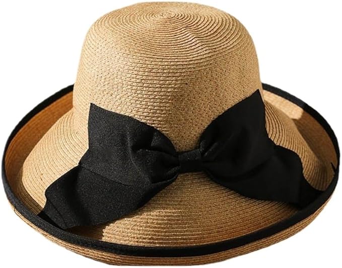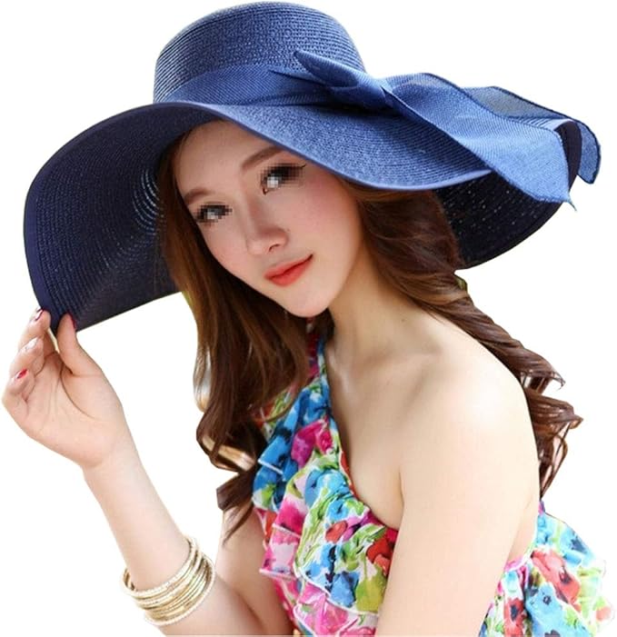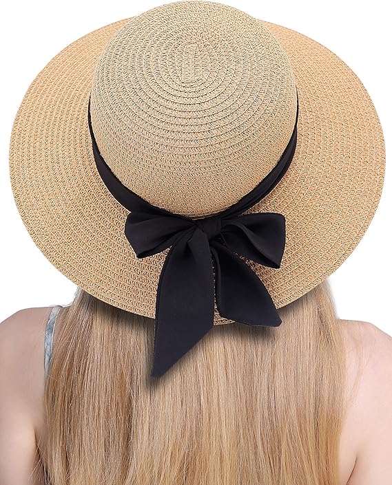 Womens Sun Straw Hat Wide Brim Summer Hat Foldable Roll up Floppy Beach Hats with Big Bowknot UPF 50+