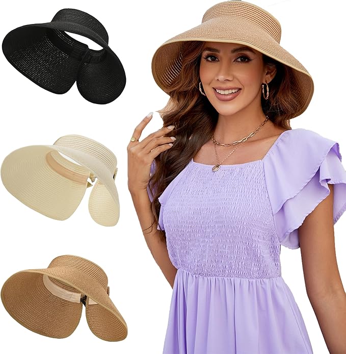 Women Sun Visor Fordable Wide Brim Summer Straw Hat Roll up Adjustable Beach Hat with Bowtie